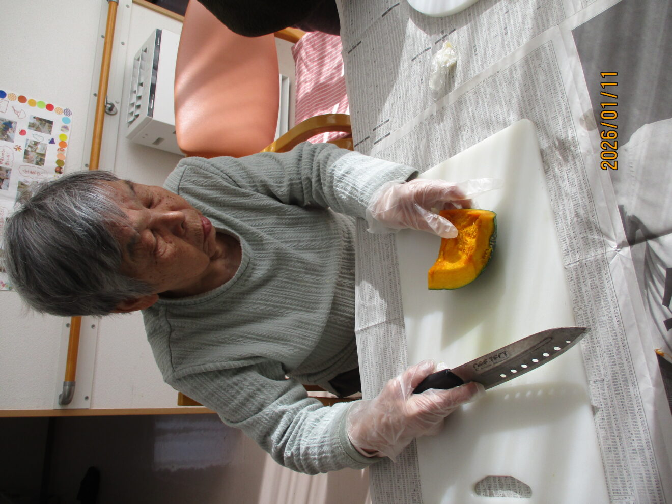 利用者様に柔らかくしたカボチャを切っていただき、